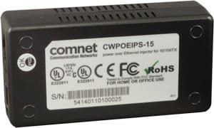 ComNet CWPOEIPS-15 is a low-cost power over Ethernet (PoE) midspan injection module that injects 48 VDC at 0.3 amperes to the unused pairs of any UTP or STP CAT-3, CAT-4, or CAT-5 network cable. Operating power and 10/100TX Ethernet data are easily combined on one cable, eliminating the need to install additional power outlets and electrical cabling. Housed in a compact, rugged, light-weight package, and utilizing a completely self-contained 100 to 240 VAC input power supply, the CWPOEIPS is fully compliant with the requirements of IEEE 802.3af for Power Sourcing Equipment (PSE), and features auto-detection of powered devices (PDs). Transmission distances of up to 330 feet (100 meters) are supported, and this injector supplies operating power for all PDs drawing a maximum of 15.4 watts. The unit provides AC line and powered device over-voltage and short circuit protection. Ideally suited to fiber optic, wireless, or other networks where it may be difficult to furnish operating power to the PDs, the CWPOEIPS is a true plug-and-play product requiring no user configuration or other set-up. The unit is designed for deployment in benign/conditioned 0 to +45 degree C operating environments.